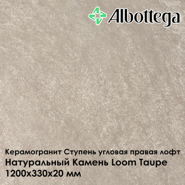 Керамогранитная ступень Albottega коллекции Натуральный Камень Loom в цвете Taupe - серо-бежевый неоднородный с разводами, представлена в формате 120х33 см, где 33 см - глубина ступени, а 120 см - её длина. Толщина ступени 20 мм. Ступень угловая правая (предназначена для оформления лестничной ступени с правой стороны), лофт (имеет прямой капинос). Поверхность - неполированная, шероховатая, имитирует фактуру скалы или необработанного камня с трещинками, класс противоскольжения R11, что обеспечивает максимальную безопасность на лестницах, в местах, где бывает скопление воды (зоны вокруг бассейнов), а также во время осадков - дождя и снега - при уличном мощении. Коллекция Натуральный Камень Loom наиболее востребована при оформлении пространств в классическом стиле.