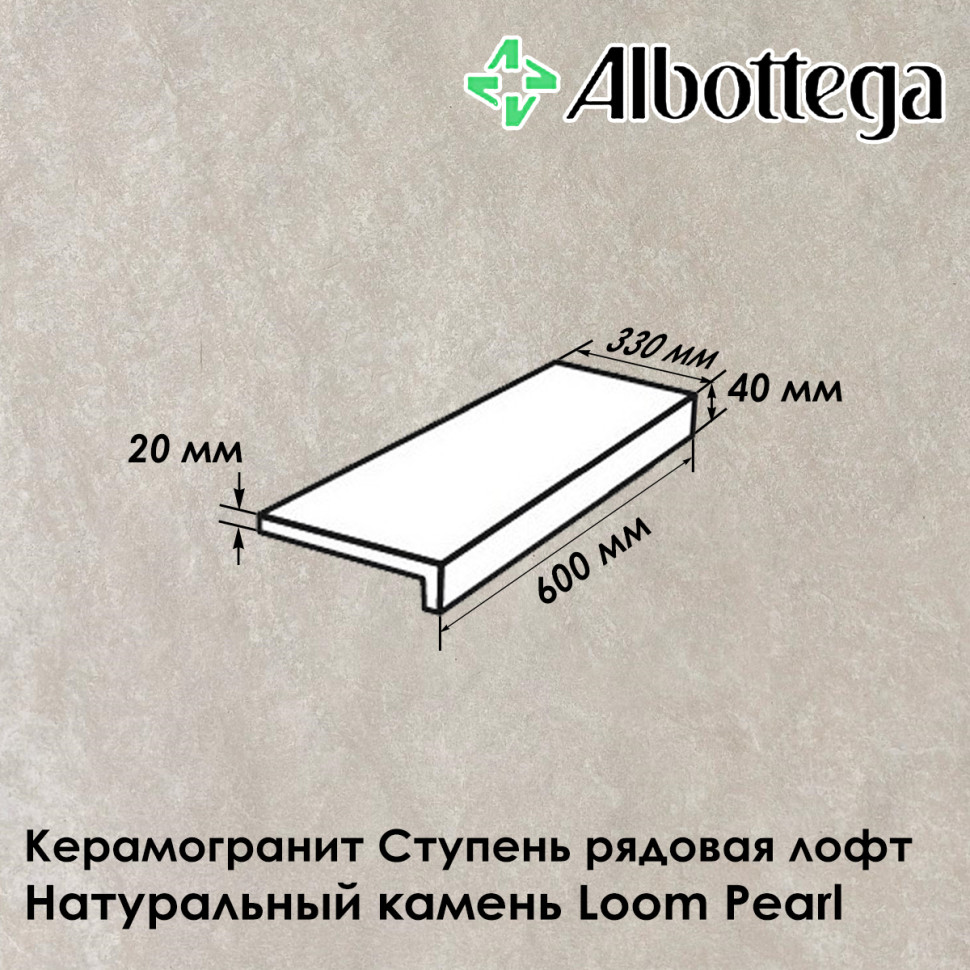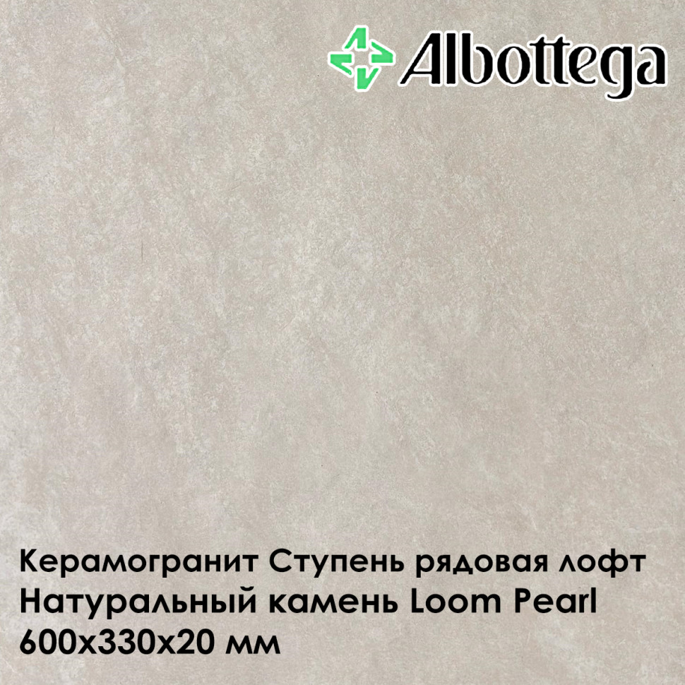 Керамогранитная ступень Albottega коллекции Натуральный камень Loom в цвете Pearl - светло-серый неоднородный с разводами, представлена в формате 60х33 см, где 33 см - глубина ступени, а 60 см - её длина. Толщина ступени 20 мм. Ступень рядовая (предназначена для устройства лестничного марша), лофт (имеет прямой капинос). Поверхность - неполированная, шероховатая, имитирует фактуру скалы или необработанного камня с трещинками, класс противоскольжения R11, что обеспечивает максимальную безопасность на лестницах, в местах, где бывает скопление воды (зоны вокруг бассейнов), а также во время осадков - дождя и снега - при уличном мощении. Коллекция Натуральный Камень Loom наиболее востребована при оформлении пространств в классическом стиле. Расход составляет 1.6 шт./пог.м.