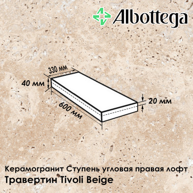 Керамогранитная ступень Albottega коллекции Травертин в цвете Tivoli Beige - бежевый, умеренно пёстрый, с рисунком, представлена в формате 60х33 см, где 33 см - глубина ступени, а 60 см - её длина. Толщина ступени 20 мм. Ступень угловая правая (предназначена для оформления лестничной ступени с правой стороны), лофт (имеет прямой капинос). Поверхность - неполированная, шероховатая, имитирует природный камень травертин с выбоинами и кавернами, класс противоскольжения R11, что обеспечивает максимальную безопасность на лестницах, в местах, где бывает скопление воды (зоны вокруг бассейнов), а также во время осадков - дождя и снега - при уличном мощении. Коллекция Травертин универсальна и востребована при оформлении пространств в различных стилях - от классического до современного.