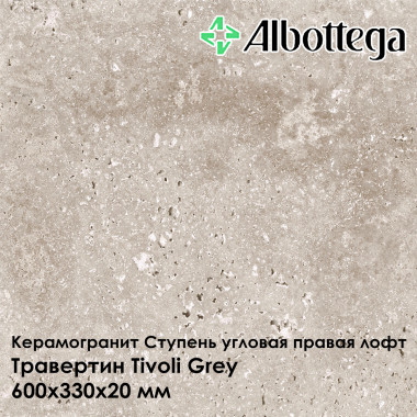 Керамогранитная ступень Albottega коллекции Травертин в цвете Tivoli Grey - серый, умеренно пёстрый, с рисунком, представлена в формате 60х33 см, где 33 см - глубина ступени, а 60 см - её длина. Толщина ступени 20 мм. Ступень угловая правая (предназначена для оформления лестничной ступени с правой стороны), лофт (имеет прямой капинос). Поверхность - неполированная, шероховатая, имитирует природный камень травертин с выбоинами и кавернами, класс противоскольжения R11, что обеспечивает максимальную безопасность на лестницах, в местах, где бывает скопление воды (зоны вокруг бассейнов), а также во время осадков - дождя и снега - при уличном мощении. Коллекция Травертин универсальна и востребована при оформлении пространств в различных стилях - от классического до современного.