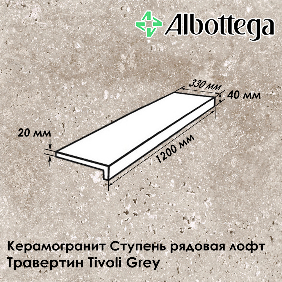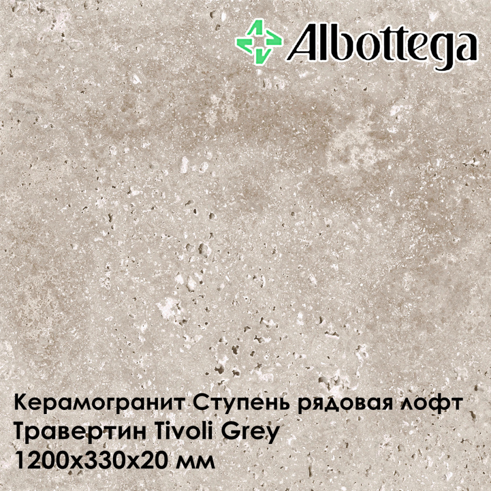 Керамогранитная ступень Albottega коллекции Травертин в цвете Tivoli Grey - серый, умеренно пёстрый, с рисунком, представлена в формате 120х33 см, где 33 см - глубина ступени, а 120 см - её длина. Толщина ступени 20 мм. Ступень рядовая (предназначена для устройства лестничного марша), лофт (имеет прямой капинос). Поверхность - неполированная, шероховатая, имитирует природный камень травертин с выбоинами и кавернами, класс противоскольжения R11, что обеспечивает максимальную безопасность на лестницах, в местах, где бывает скопление воды (зоны вокруг бассейнов), а также во время осадков - дождя и снега - при уличном мощении. Коллекция Травертин универсальна и востребована при оформлении пространств в различных стилях - от классического до современного. Расход составляет 0.83 шт./пог.м.