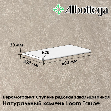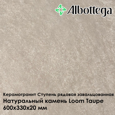 Керамогранитная ступень Albottega коллекции Натуральный камень Loom в цвете Taupe - серо-бежевый неоднородный с разводами, представлена в формате 60х33 см, где 33 см - глубина ступени, а 60 см - её длина. Толщина ступени 20 мм. Ступень рядовая (предназначена для устройства лестничного марша), завальцованная (имеет скруглённый край). Поверхность - неполированная, шероховатая, имитирует фактуру скалы или необработанного камня с трещинками, класс противоскольжения R11, что обеспечивает максимальную безопасность на лестницах, в местах, где бывает скопление воды (зоны вокруг бассейнов), а также во время осадков - дождя и снега - при уличном мощении. Коллекция Натуральный Камень Loom наиболее востребована при оформлении пространств в классическом стиле. Расход составляет 1.6 шт./пог.м.