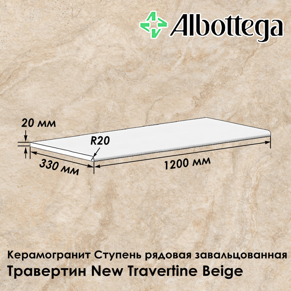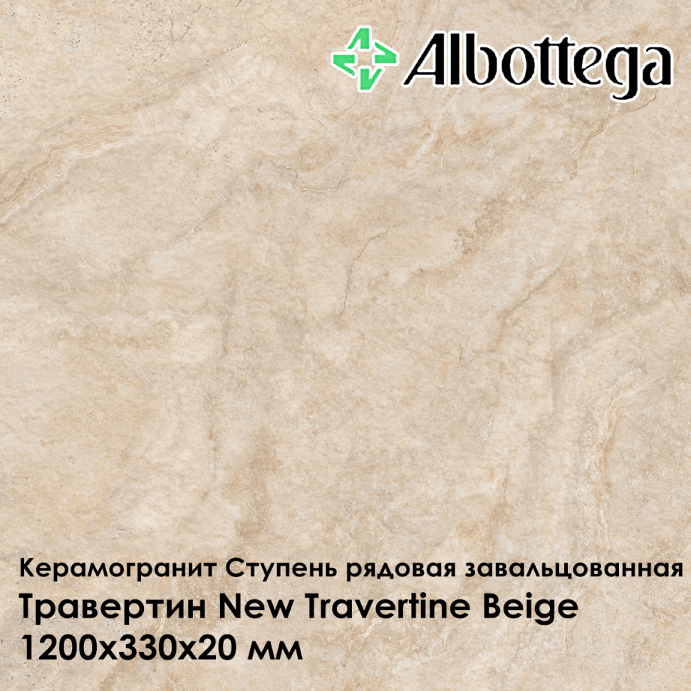 Керамогранитная ступень Albottega коллекции Травертин New Travertine в цвете Beige - бежевый, умеренно пёстрый, с рисунком, представлена в формате 120х33 см, где 33 см - глубина ступени, а 120 см - её длина. Толщина ступени 20 мм. Ступень рядовая (предназначена для устройства лестничного марша), завальцованная (имеет скруглённый край). Поверхность - неполированная, шероховатая, имитирует природный камень травертин, класс противоскольжения R11, что обеспечивает максимальную безопасность на лестницах, в местах, где бывает скопление воды (зоны вокруг бассейнов), а также во время осадков - дождя и снега - при уличном мощении. Коллекция Травертин универсальна и востребована при оформлении пространств в различных стилях - от классического до современного. Расход составляет 0.83 шт./пог.м.