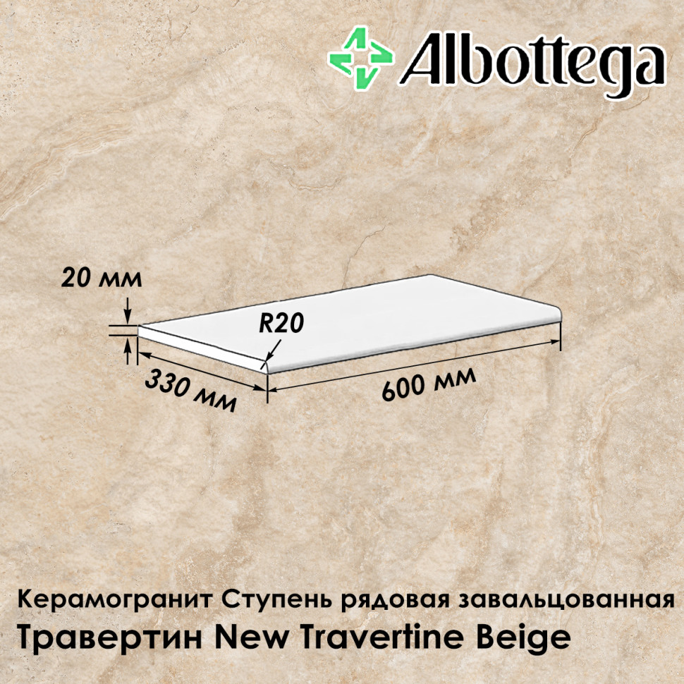 Керамогранитная ступень Albottega коллекции Травертин New Travertine в цвете Beige - бежевый, умеренно пёстрый, с рисунком, представлена в формате 60х33 см, где 33 см - глубина ступени, а 60 см - её длина. Толщина ступени 20 мм. Ступень рядовая (предназначена для устройства лестничного марша), завальцованная (имеет скруглённый край). Поверхность - неполированная, шероховатая, имитирует природный камень травертин, класс противоскольжения R11, что обеспечивает максимальную безопасность на лестницах, в местах, где бывает скопление воды (зоны вокруг бассейнов), а также во время осадков - дождя и снега - при уличном мощении. Коллекция Травертин универсальна и востребована при оформлении пространств в различных стилях - от классического до современного. Расход составляет 1.6 шт./пог.м.