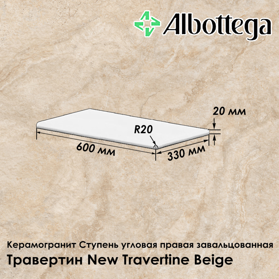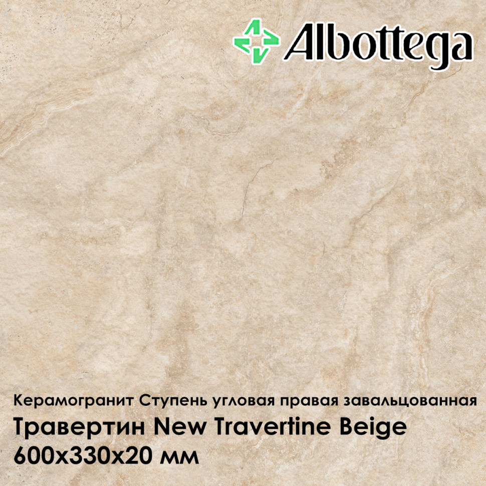 Керамогранитная ступень Albottega коллекции Травертин New Travertine в цвете Beige - бежевый, умеренно пёстрый, с рисунком, представлена в формате 60х33 см, где 33 см - глубина ступени, а 60 см - её длина. Толщина ступени 20 мм. Ступень угловая правая (предназначена для оформления лестничной ступени с правой стороны), завальцованная (имеет скруглённый край). Поверхность - неполированная, шероховатая, имитирует природный камень травертин, класс противоскольжения R11, что обеспечивает максимальную безопасность на лестницах, в местах, где бывает скопление воды (зоны вокруг бассейнов), а также во время осадков - дождя и снега - при уличном мощении. Коллекция Травертин универсальна и востребована при оформлении пространств в различных стилях - от классического до современного.