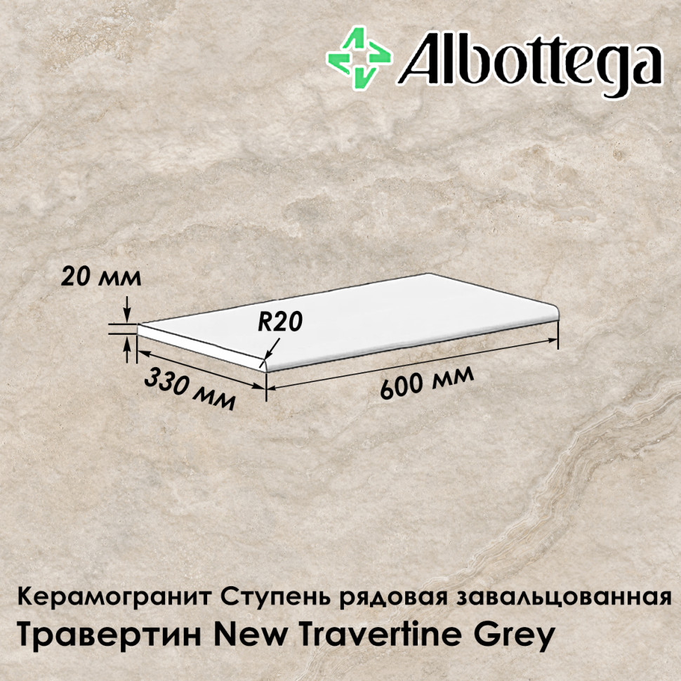 Керамогранитная ступень Albottega коллекции Травертин New Travertine в цвете Grey - серый, умеренно пёстрый, с рисунком, представлена в формате 60х33 см, где 33 см - глубина ступени, а 60 см - её длина. Толщина ступени 20 мм. Ступень рядовая (предназначена для устройства лестничного марша), завальцованная (имеет скруглённый край). Поверхность - неполированная, шероховатая, имитирует природный камень травертин, класс противоскольжения R11, что обеспечивает максимальную безопасность на лестницах, в местах, где бывает скопление воды (зоны вокруг бассейнов), а также во время осадков - дождя и снега - при уличном мощении. Коллекция Травертин универсальна и востребована при оформлении пространств в различных стилях - от классического до современного. Расход составляет 1.6 шт./пог.м.