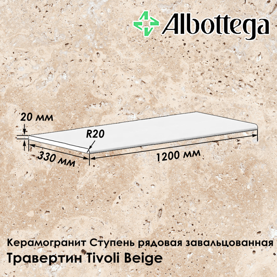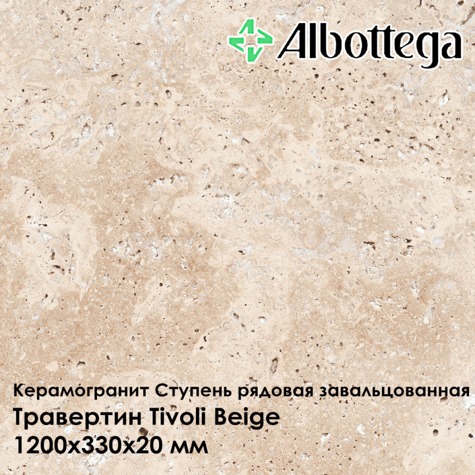 Керамогранитная ступень Albottega коллекции Травертин в цвете Tivoli Beige - бежевый, умеренно пёстрый, с рисунком, представлена в формате 120х33 см, где 33 см - глубина ступени, а 120 см - её длина. Толщина ступени 20 мм. Ступень рядовая (предназначена для устройства лестничного марша), завальцованная (имеет скруглённый край). Поверхность - неполированная, шероховатая, имитирует природный камень травертин с выбоинами и кавернами, класс противоскольжения R11, что обеспечивает максимальную безопасность на лестницах, в местах, где бывает скопление воды (зоны вокруг бассейнов), а также во время осадков - дождя и снега - при уличном мощении. Коллекция Травертин универсальна и востребована при оформлении пространств в различных стилях - от классического до современного. Расход составляет 0.83 шт./пог.м.