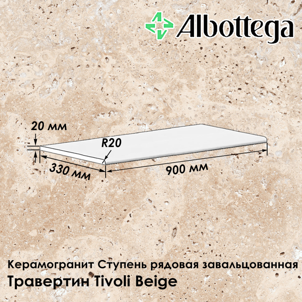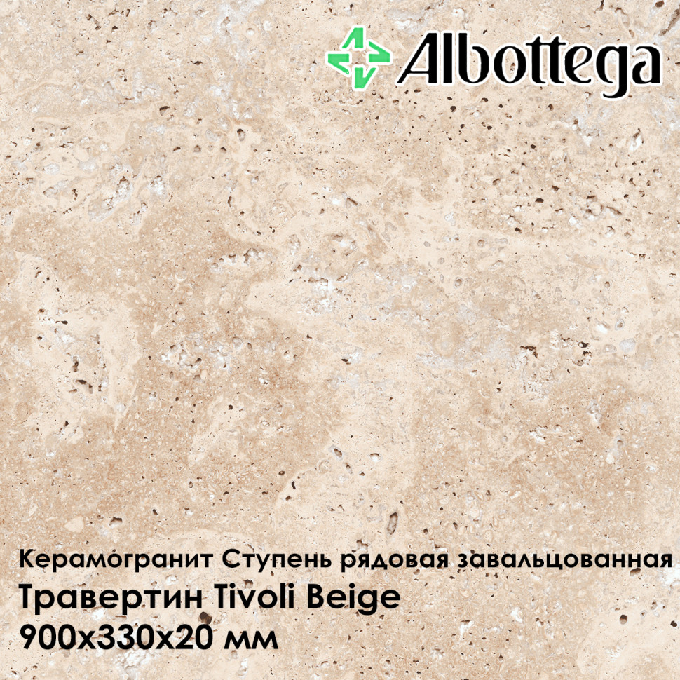 Керамогранитная ступень Albottega коллекции Травертин в цвете Tivoli Beige - бежевый, умеренно пёстрый, с рисунком, представлена в формате 90х33 см, где 33 см - глубина ступени, а 90 см - её длина. Толщина ступени 20 мм. Ступень рядовая (предназначена для устройства лестничного марша), завальцованная (имеет скруглённый край). Поверхность - неполированная, шероховатая, имитирует природный камень травертин с выбоинами и кавернами, класс противоскольжения R11, что обеспечивает максимальную безопасность на лестницах, в местах, где бывает скопление воды (зоны вокруг бассейнов), а также во время осадков - дождя и снега - при уличном мощении. Коллекция Травертин универсальна и востребована при оформлении пространств в различных стилях - от классического до современного. Расход составляет 1.1 шт./пог.м.