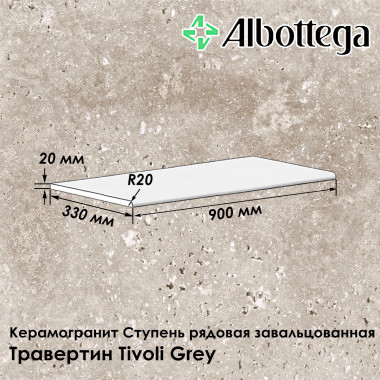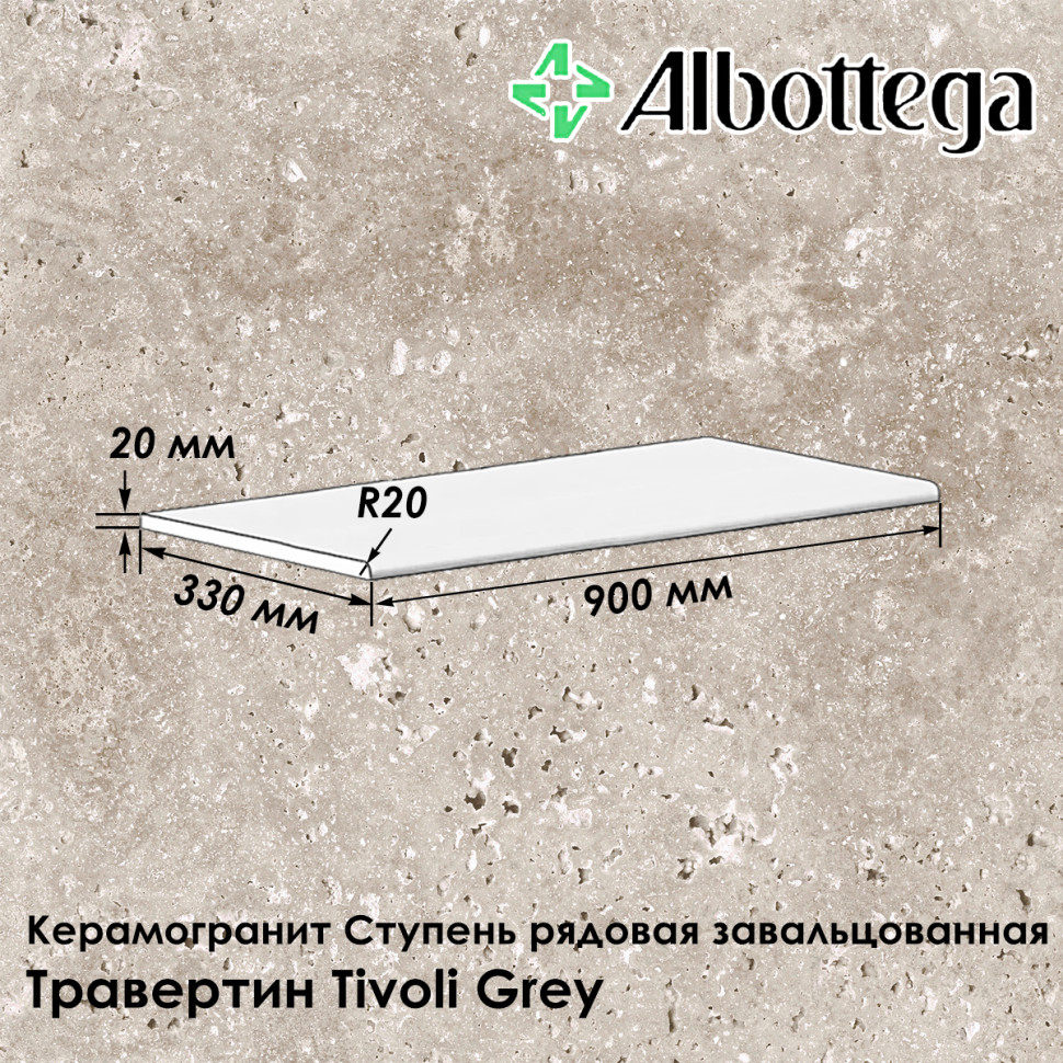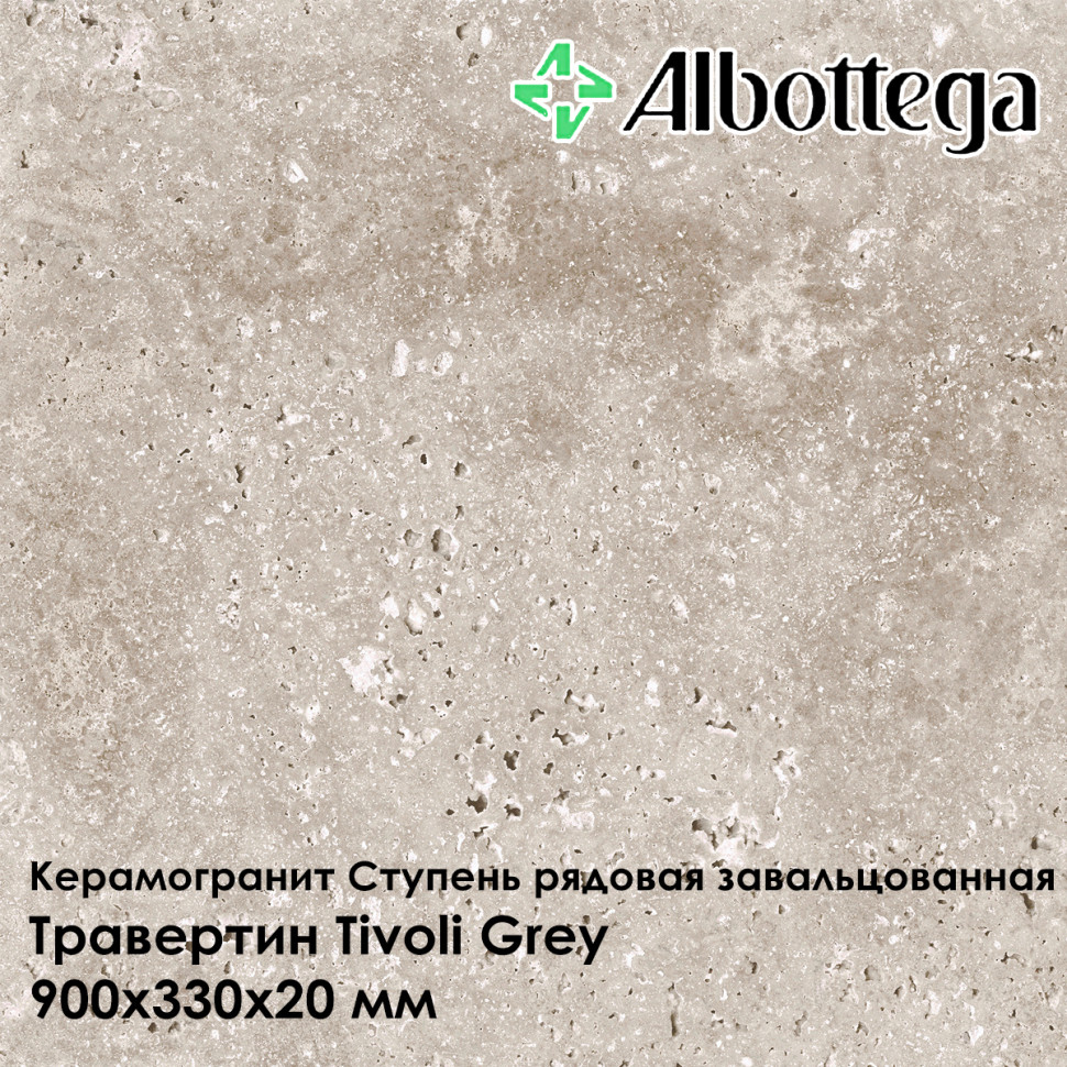 Керамогранитная ступень Albottega коллекции Травертин в цвете Tivoli Grey - серый, умеренно пёстрый, с рисунком, представлена в формате 90х33 см, где 33 см - глубина ступени, а 90 см - её длина. Толщина ступени 20 мм. Ступень рядовая (предназначена для устройства лестничного марша), завальцованная (имеет скруглённый край). Поверхность - неполированная, шероховатая, имитирует природный камень травертин с выбоинами и кавернами, класс противоскольжения R11, что обеспечивает максимальную безопасность на лестницах, в местах, где бывает скопление воды (зоны вокруг бассейнов), а также во время осадков - дождя и снега - при уличном мощении. Коллекция Травертин универсальна и востребована при оформлении пространств в различных стилях - от классического до современного. Расход составляет 1.1 шт./пог.м.