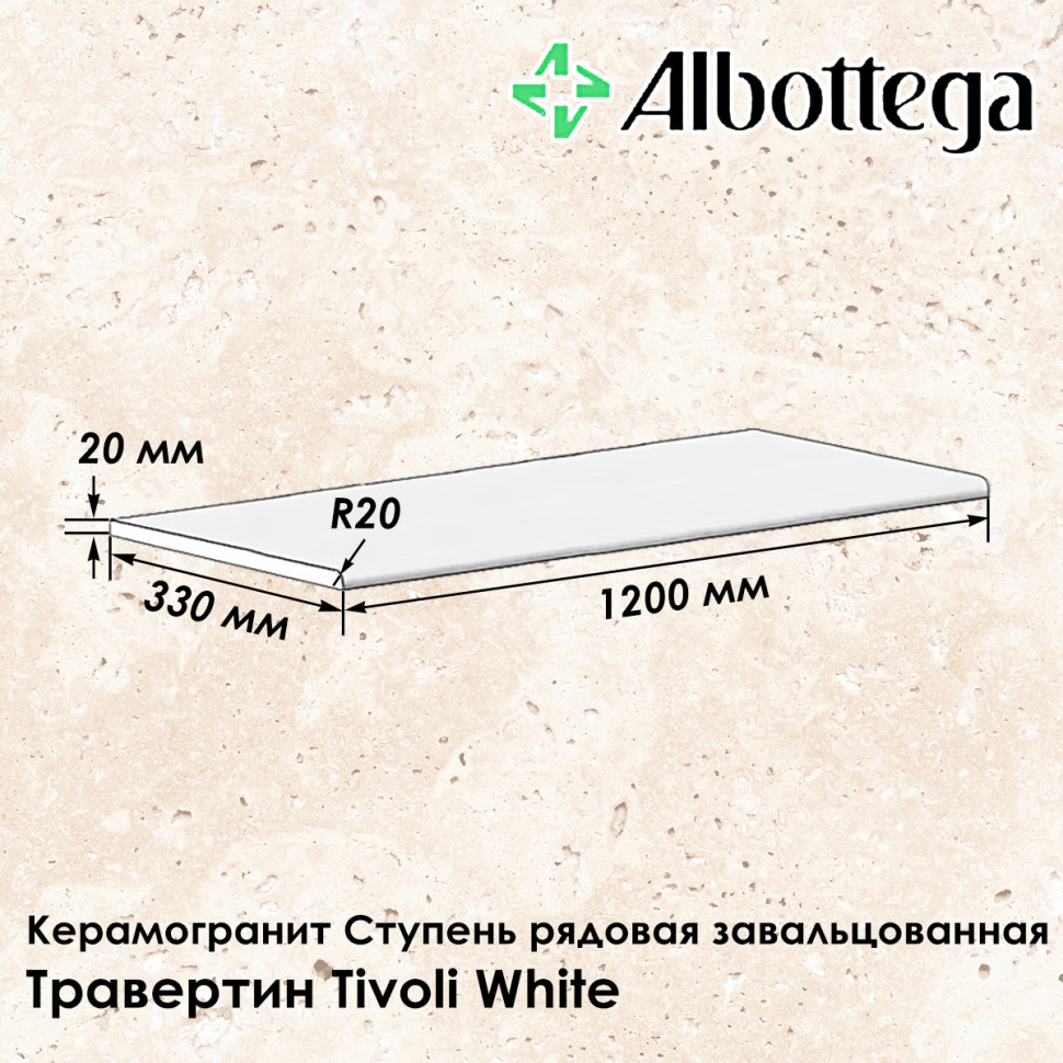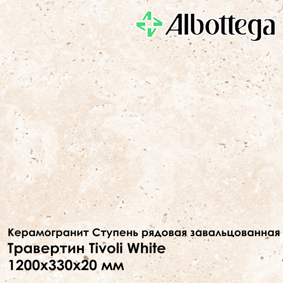 Керамогранитная ступень Albottega коллекции Травертин в цвете Tivoli White - белый, умеренно пёстрый, с рисунком, представлена в формате 120х33 см, где 33 см - глубина ступени, а 120 см - её длина. Толщина ступени 20 мм. Ступень рядовая (предназначена для устройства лестничного марша), завальцованная (имеет скруглённый край). Поверхность - неполированная, шероховатая, имитирует природный камень травертин с выбоинами и кавернами, класс противоскольжения R11, что обеспечивает максимальную безопасность на лестницах, в местах, где бывает скопление воды (зоны вокруг бассейнов), а также во время осадков - дождя и снега - при уличном мощении. Коллекция Травертин универсальна и востребована при оформлении пространств в различных стилях - от классического до современного. Расход составляет 0.83 шт./пог.м.