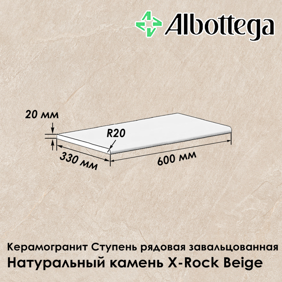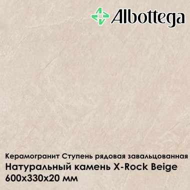 Керамогранитная ступень Albottega коллекции Натуральный камень X-Rock в цвете Beige - бежевый неоднородный с прожилками, представлена в формате 60х33 см, где 33 см - глубина ступени, а 60 см - её длина. Толщина ступени 20 мм. Ступень рядовая (предназначена для устройства лестничного марша), завальцованная (имеет скруглённый край). Поверхность - неполированная, шероховатая, имитирует фактуру скалы или необработанного камня с трещинками, класс противоскольжения R11, что обеспечивает максимальную безопасность на лестницах, в местах, где бывает скопление воды (зоны вокруг бассейнов), а также во время осадков - дождя и снега - при уличном мощении. Коллекция Натуральный Камень X-Rock наиболее востребована при оформлении пространств в классическом стиле. Расход составляет 1.6 шт./пог.м.