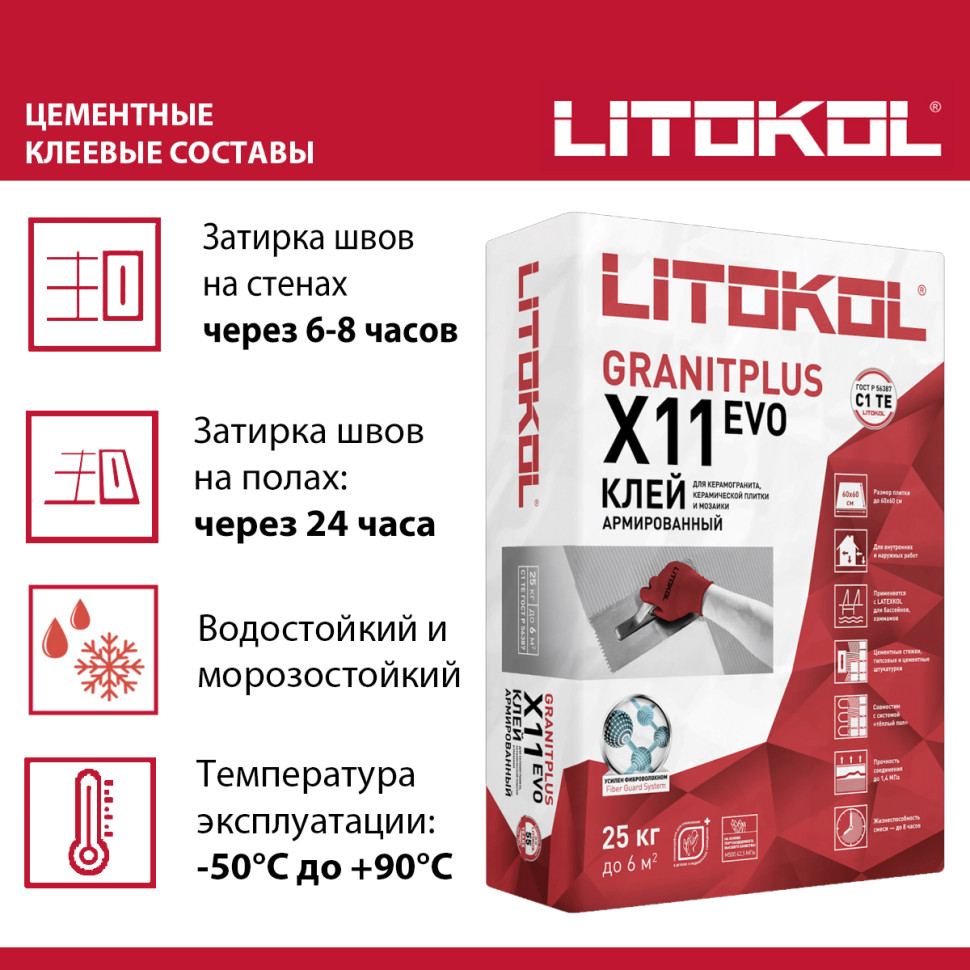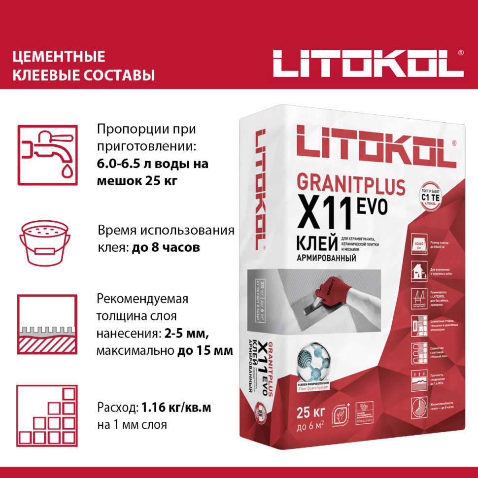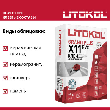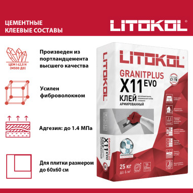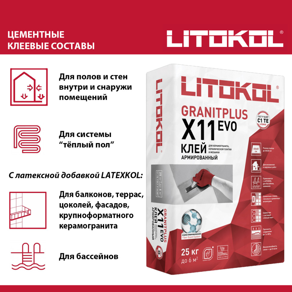 Клей для плитки Litokol Granitplus X 11 – клей на основе серого цемента, который относится к классу C1TE (C1 - цементный с увеличенной адгезией - до 1.4 МПа, T - тиксотропный (устойчивый к оползанию), E - с увеличенным открытым временем - до 8 часов). Это один из недорогих составов с улучшенными характеристиками, усиленный фиброволокном. Годен для приклеивания керамической плитки, керамогранита, мозаики и камня размером до 60х60 см на горизонтальные и вертикальные стабильные основания снаружи и внутри помещений любой влажности (не переносит прямого воздействия воды, но подходит для ванных комнат, санузлов и кухонь). Имеет хорошие прочностные показатели, используется в системах "тёплый пол". Добавление Latexkol вместо воды при затворении смеси существенно расширяет область применения клеевого состава - его можно применять для облицовки оснований, подверженных деформации и усадке, цоколей и фасадов, террас и балконов, бассейнов, существующих плиточных поверхностей. Также латексная добавка позволяет использовать Litokol Granitplus X 11 для приклеивания крупноформатного керамогранита.