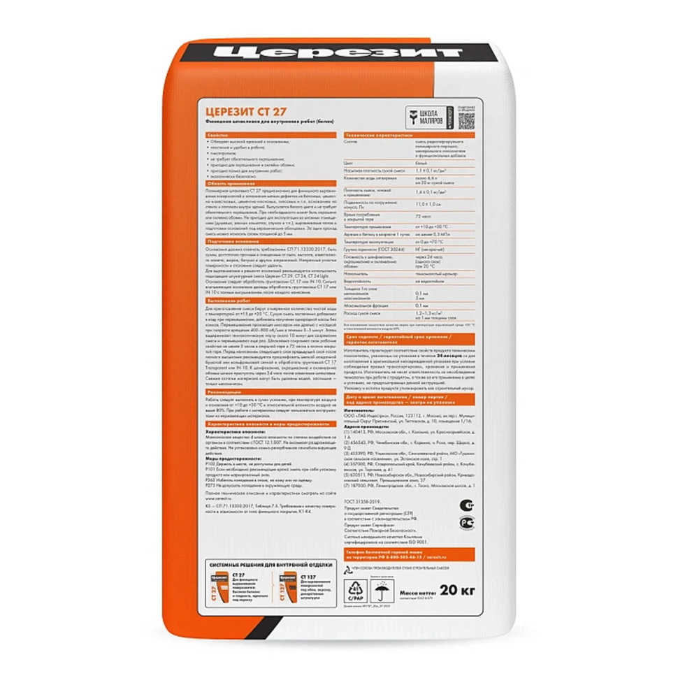 Финишная шпаклевка Церезит CT 27 представляет собой смесь редиспергируемых полимерных порошков и минеральных наполнителей и функциональных добавок. Используется только внутри зданий, не пригодна для обработки поверхностей во влажных помещениях, таких как ванные, душевые, сауны, а также для выравнивания полов и подготовки оснований под облицовку плиткой. Слой нанесения 0.1-5 мм, предназначена для финишного выравнивания поверхностей стен и потолков, а также для заполнения мелких дефектов. Работает на следующих основаниях: бетонные, цементные и гипсовые штукатурки, гипсокартон. Благодаря содержанию тонкомолотого мрамора (до 0.1 мм) создаёт идеально гладкую поверхность, которую легко шлифовать. Белоснежная, её можно не окрашивать, но при желании возможны окраска и оклеивание обоями.