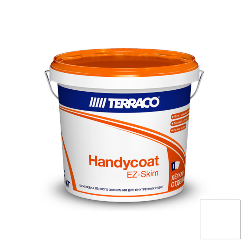 Terraco Handycoat EZ-Skim - готовая к применению акриловая тонкослойная шпатлёвка, предназначена для высококачественного финишного выравнивания внутренних поверхностей в сухих помещениях и подготовки их под отделку - окраску, нанесение декоративных покрытий, оклейку обоями. Содержит специально подобранные связующие, наполнители и добавки, благодаря которым отличается пластичностью и удобством нанесения, быстро сохнет, обладает превосходной адгезией к различным строительным основаниям и низкой усадкой. Нанесение - ручное (с помощью шпателя или кельмы), при разбавлении водой возможно механизированное (с помощью распылителя).