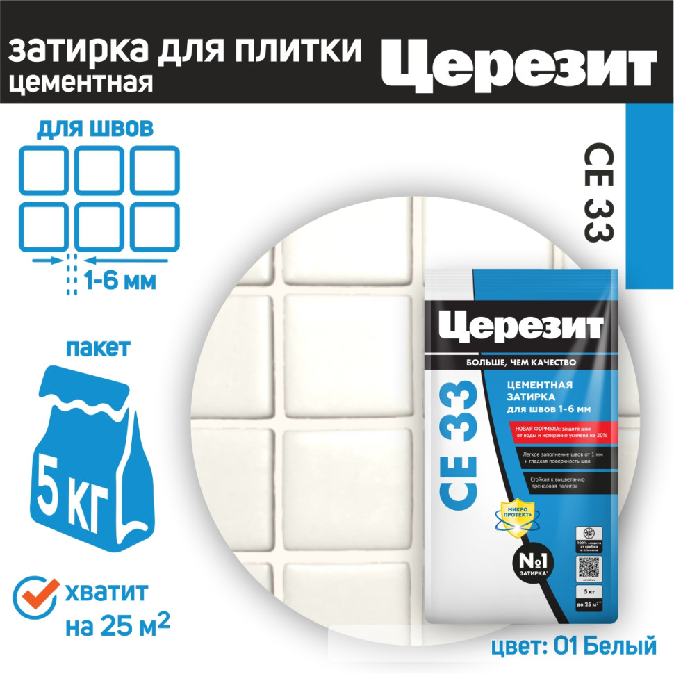 Цвет затирки Церезит СЕ33 01 - Белый - ярко белый цвет. Фасовка 5 кг предназначена для выполнения плиточных работ на площади до 25 м2.