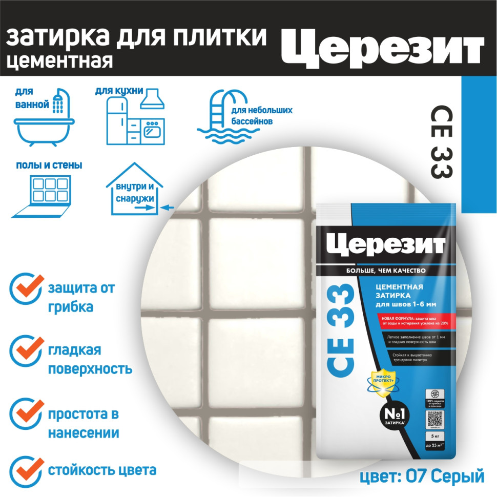 Затирка для плитки Ceresit CE 33 – цветной цементный состав для заполнения узких плиточных швов. Предназначена для швов от 1 до 6 мм. В состав включены противогрибковые добавки, обеспечивающие защиту от образования пятен грибка и плесени. Состав предназначен для применения в сухих помещениях и помещениях с частым увлажнением (ванные, душевые, кухни и пр.), также допускается применение при производстве наружных работ (с поправкой на ширину шва - строго до 6 мм и стабильность основания - состав работает только по стабильным основаниям без риска возникновения деформаций). Может применяться для заполнения швов в плитке в небольших бассейнах. Следует обратить внимание на то, что в состав затирки CE 33 не входят гидрофобизирующие добавки, и при необходимости, швы после монтажа можно обработать гидрофобизирующей пропиткой для швов Ceresit CT 10 или рассмотреть приобретение затирки Ceresit CE 40, в состав которой уже входят все необходимые компоненты.