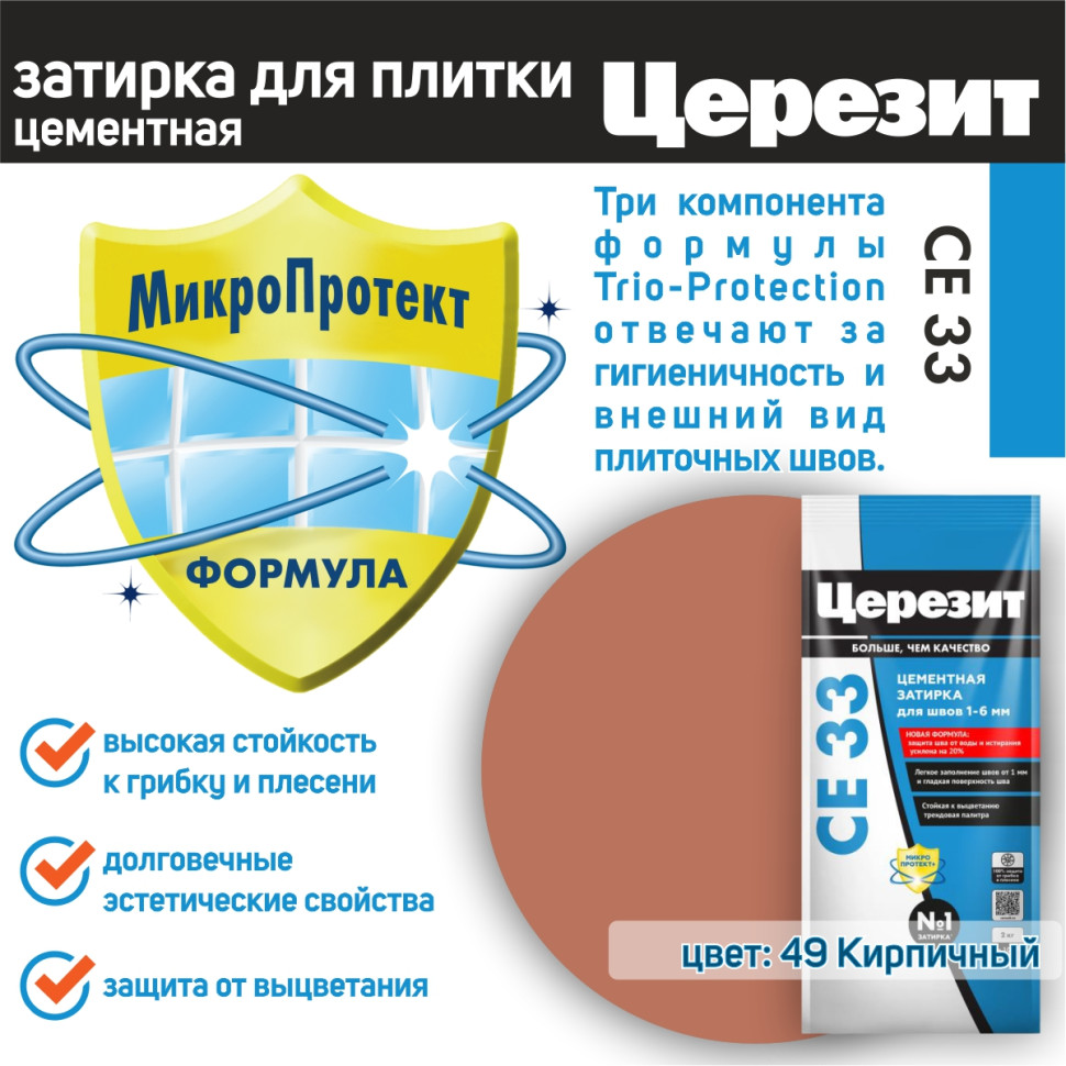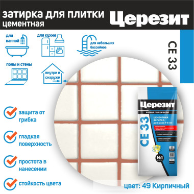 Цвет затирки Церезит СЕ33 49 - Кирпичный - насыщенный красно коричневый цвет, цвет обожженой глины. Фасовка 2 кг предназначена для выполнения типовых плиточных работ.