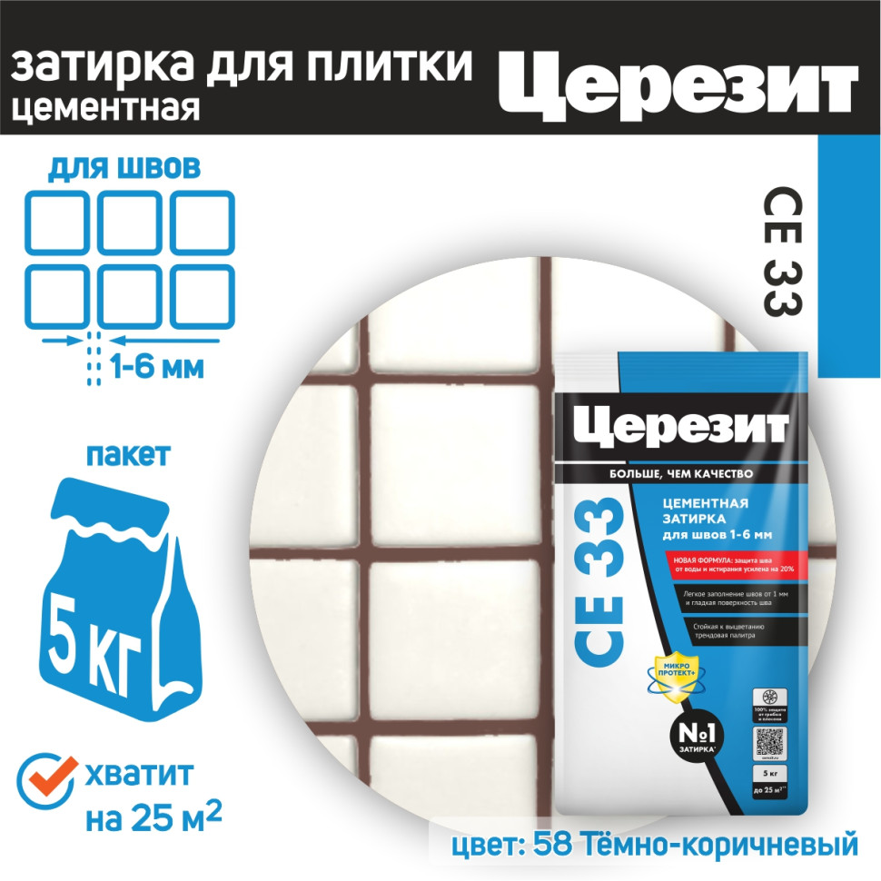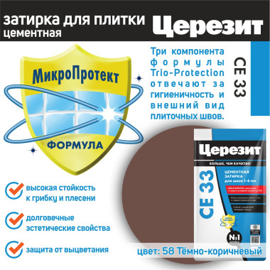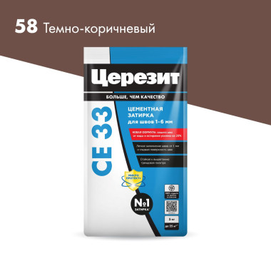 Цвет затирки Церезит СЕ33 58 - Темно Коричневый - насыщенный темный коричневый цвет, цвет горького шоколада. Фасовка 5 кг предназначена для выполнения плиточных работ на площади до 25 м2.