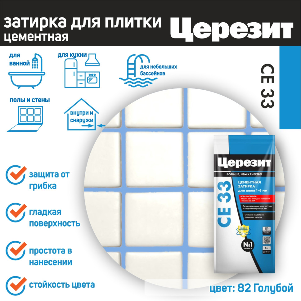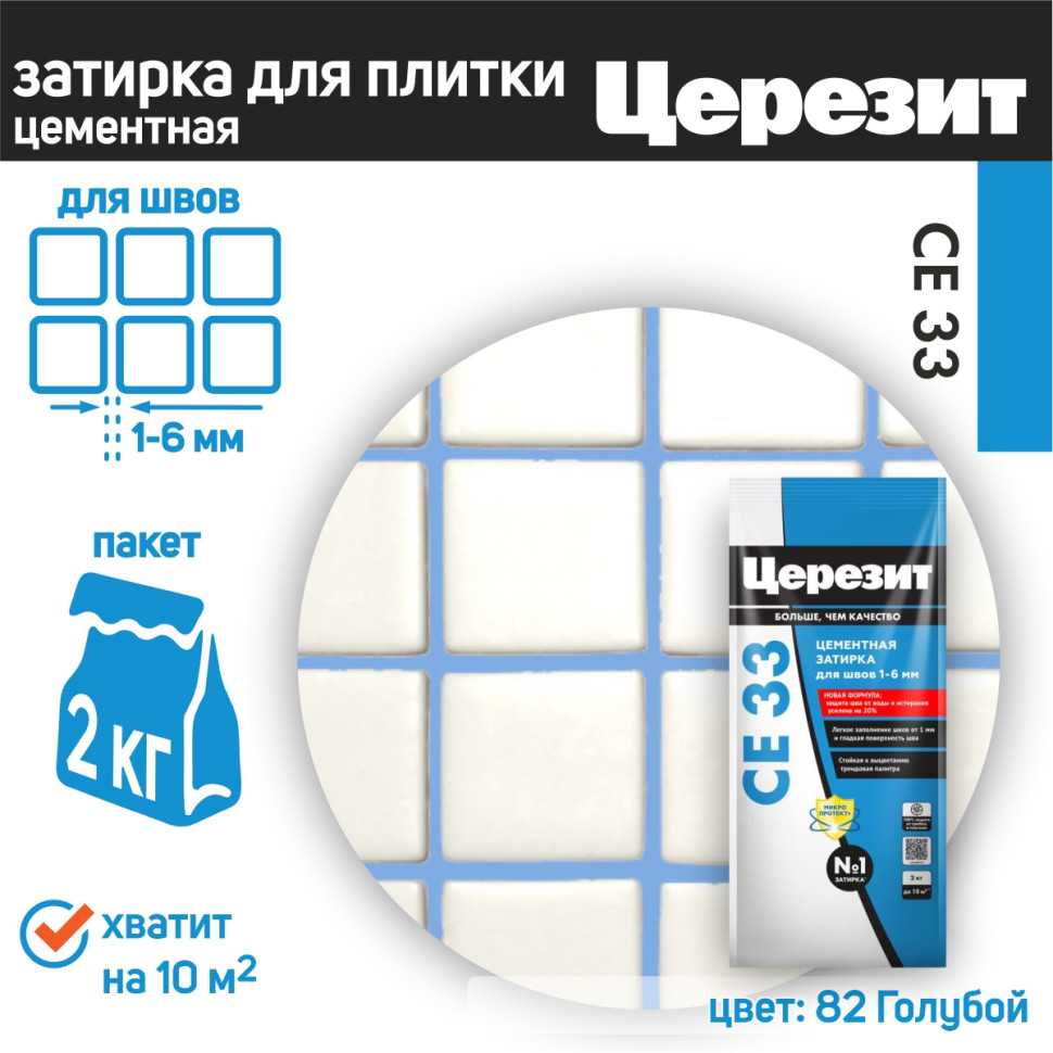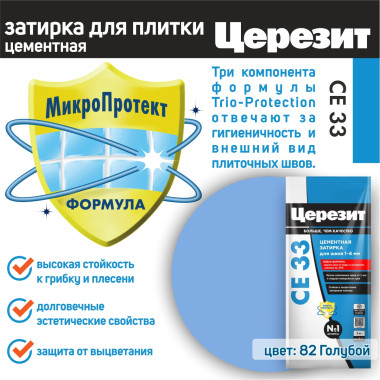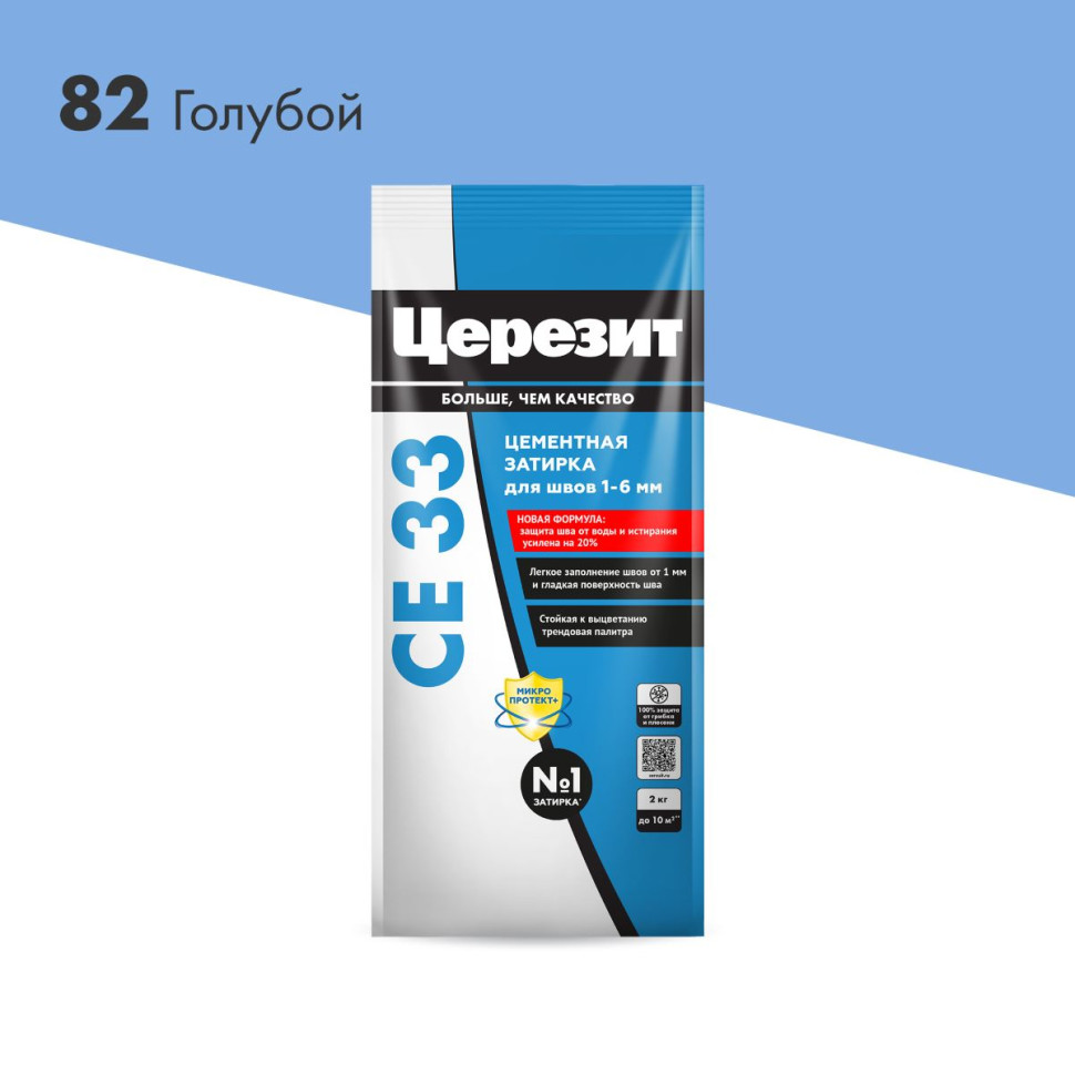 Цвет затирки Церезит СЕ33 82 - Голубой - насыщенный ярко голубой цвет, цвет ясного летнего неба. Фасовка 2 кг предназначена для выполнения типовых плиточных работ.