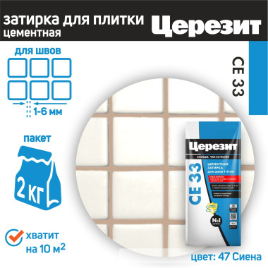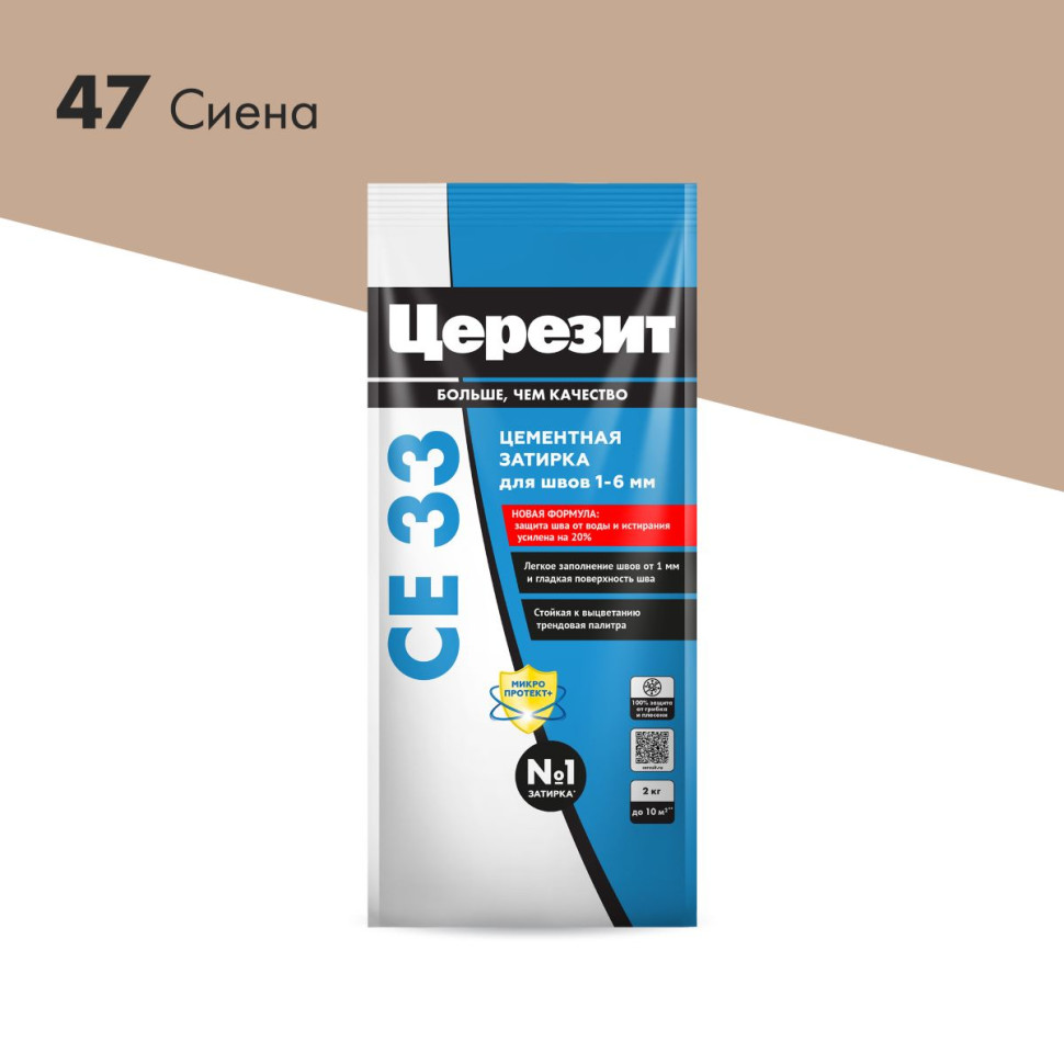 Цвет затирки Церезит СЕ33 47 - Сиена - насыщенный ярко коричневый цвет, с оттенками рыжего. Фасовка 2 кг предназначена для выполнения типовых плиточных работ.