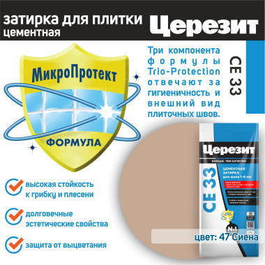 Затирка для плитки Ceresit CE 33 – цветной цементный состав для заполнения узких плиточных швов. Предназначена для швов от 1 до 6 мм. В состав включены противогрибковые добавки, обеспечивающие защиту от образования пятен грибка и плесени. Состав предназначен для применения в сухих помещениях и помещениях с частым увлажнением (ванные, душевые, кухни и пр.), также допускается применение при производстве наружных работ (с поправкой на ширину шва - строго до 6 мм и стабильность основания - состав работает только по стабильным основаниям без риска возникновения деформаций). Может применяться для заполнения швов в плитке в небольших бассейнах. Следует обратить внимание на то, что в состав затирки CE 33 не входят гидрофобизирующие добавки, и при необходимости, швы после монтажа можно обработать гидрофобизирующей пропиткой для швов Ceresit CT 10 или рассмотреть приобретение затирки Ceresit CE 40, в состав которой уже входят все необходимые компоненты.