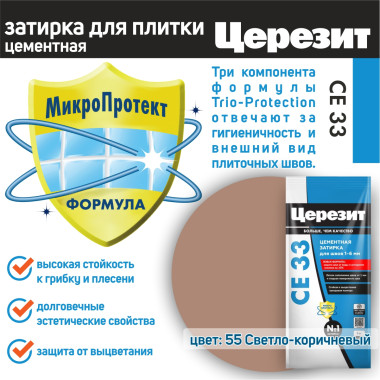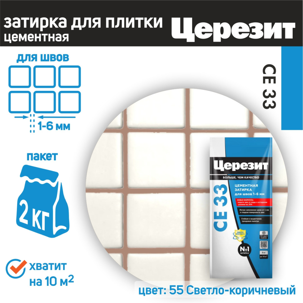 Цвет затирки Церезит СЕ33 55 - Светло Коричневый - насыщенный ярко коричневый цвет, цвет молочного шоколада. Фасовка 2 кг предназначена для выполнения типовых плиточных работ.