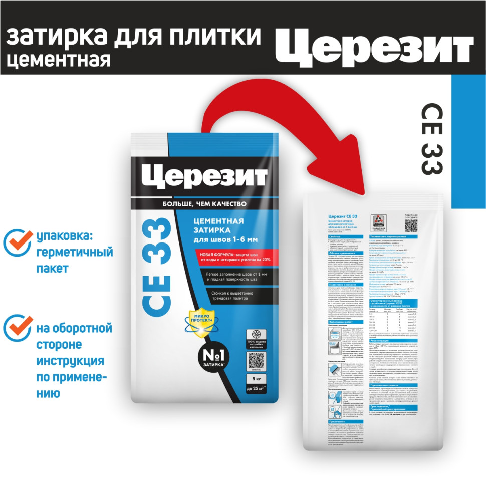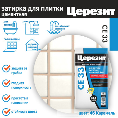 Затирка для плитки Ceresit CE 33 – цветной цементный состав для заполнения узких плиточных швов. Предназначена для швов от 1 до 6 мм. В состав включены противогрибковые добавки, обеспечивающие защиту от образования пятен грибка и плесени. Состав предназначен для применения в сухих помещениях и помещениях с частым увлажнением (ванные, душевые, кухни и пр.), также допускается применение при производстве наружных работ (с поправкой на ширину шва - строго до 6 мм и стабильность основания - состав работает только по стабильным основаниям без риска возникновения деформаций). Может применяться для заполнения швов в плитке в небольших бассейнах. Следует обратить внимание на то, что в состав затирки CE 33 не входят гидрофобизирующие добавки, и при необходимости, швы после монтажа можно обработать гидрофобизирующей пропиткой для швов Ceresit CT 10 или рассмотреть приобретение затирки Ceresit CE 40, в состав которой уже входят все необходимые компоненты.