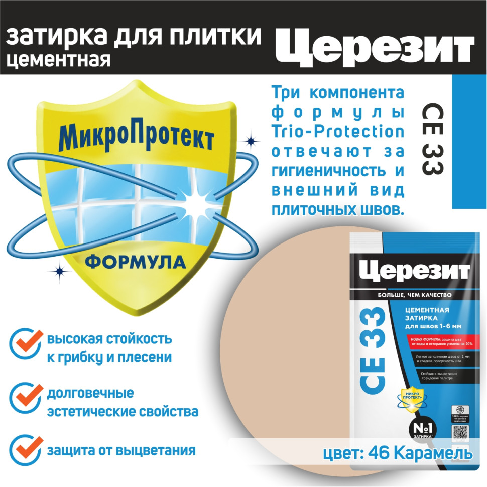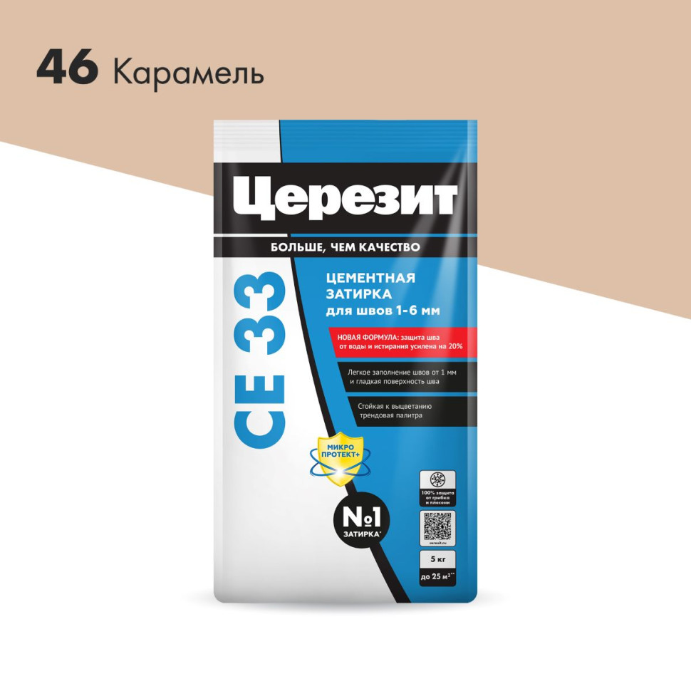 Цвет затирки Церезит СЕ33 46 - Карамель - насыщенный бежевый цвет, с оттенками кремового. Фасовка 5 кг предназначена для выполнения плиточных работ на площади до 25 м2.