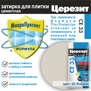 Затирка для плитки Ceresit CE 33 – цветной цементный состав для заполнения узких плиточных швов. Предназначена для швов от 1 до 6 мм. В состав включены противогрибковые добавки, обеспечивающие защиту от образования пятен грибка и плесени. Состав предназначен для применения в сухих помещениях и помещениях с частым увлажнением (ванные, душевые, кухни и пр.), также допускается применение при производстве наружных работ (с поправкой на ширину шва - строго до 6 мм и стабильность основания - состав работает только по стабильным основаниям без риска возникновения деформаций). Может применяться для заполнения швов в плитке в небольших бассейнах. Следует обратить внимание на то, что в состав затирки CE 33 не входят гидрофобизирующие добавки, и при необходимости, швы после монтажа можно обработать гидрофобизирующей пропиткой для швов Ceresit CT 10 или рассмотреть приобретение затирки Ceresit CE 40, в состав которой уже входят все необходимые компоненты.