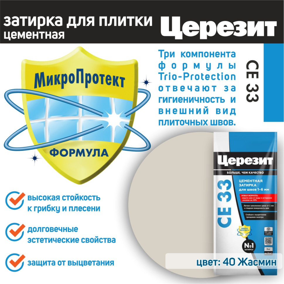 Цвет затирки Церезит СЕ33 40 - Жасмин - светлый бело бежевый цвет, с легкими оттенками желтого. Фасовка 2 кг предназначена для выполнения типовых плиточных работ.