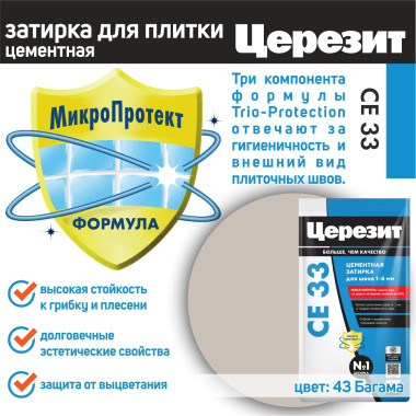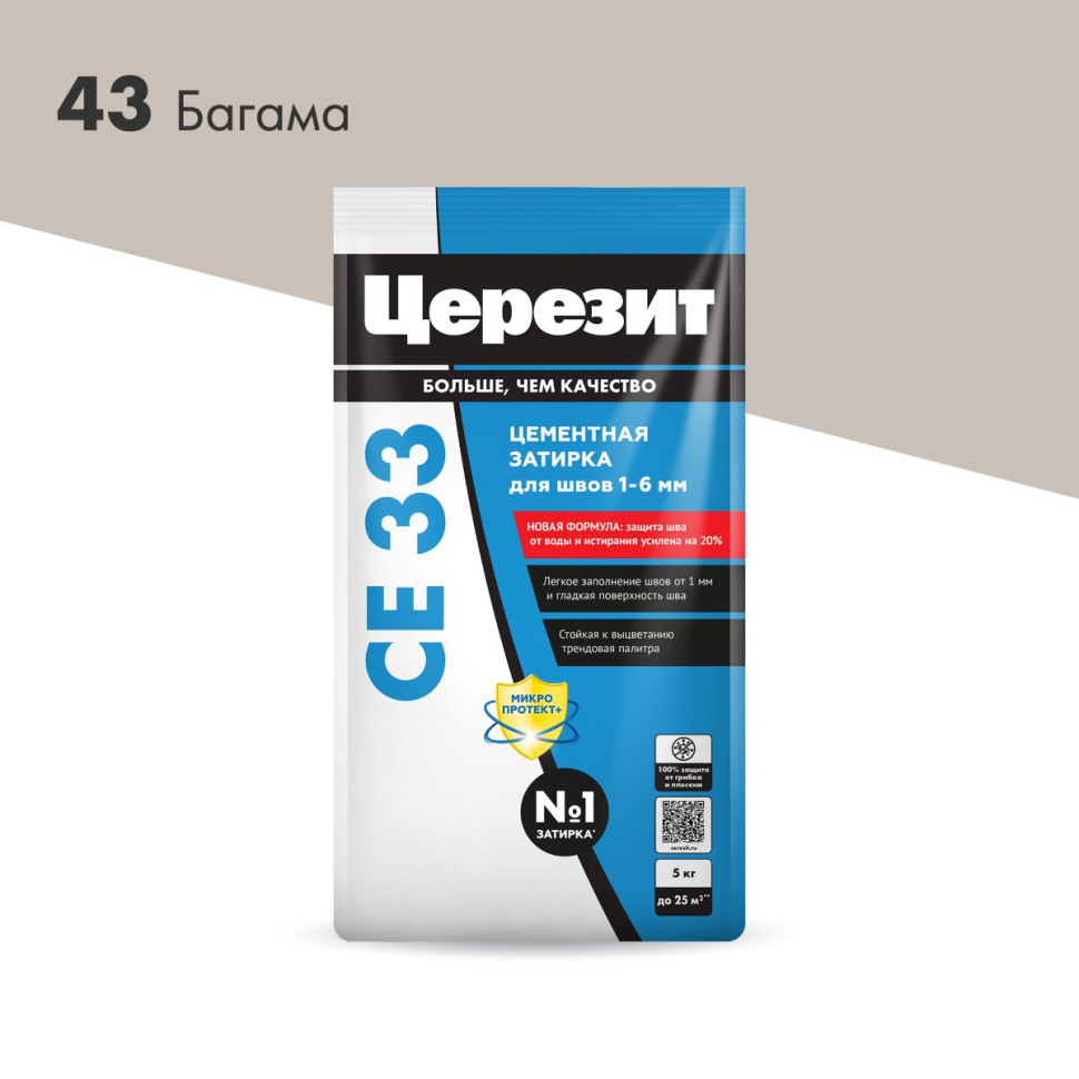 Цвет затирки Церезит СЕ33 43 - Багама - светлый бежевый цвет, с легкими оттенками серого. Фасовка 5 кг предназначена для выполнения плиточных работ на площади до 25 м2.