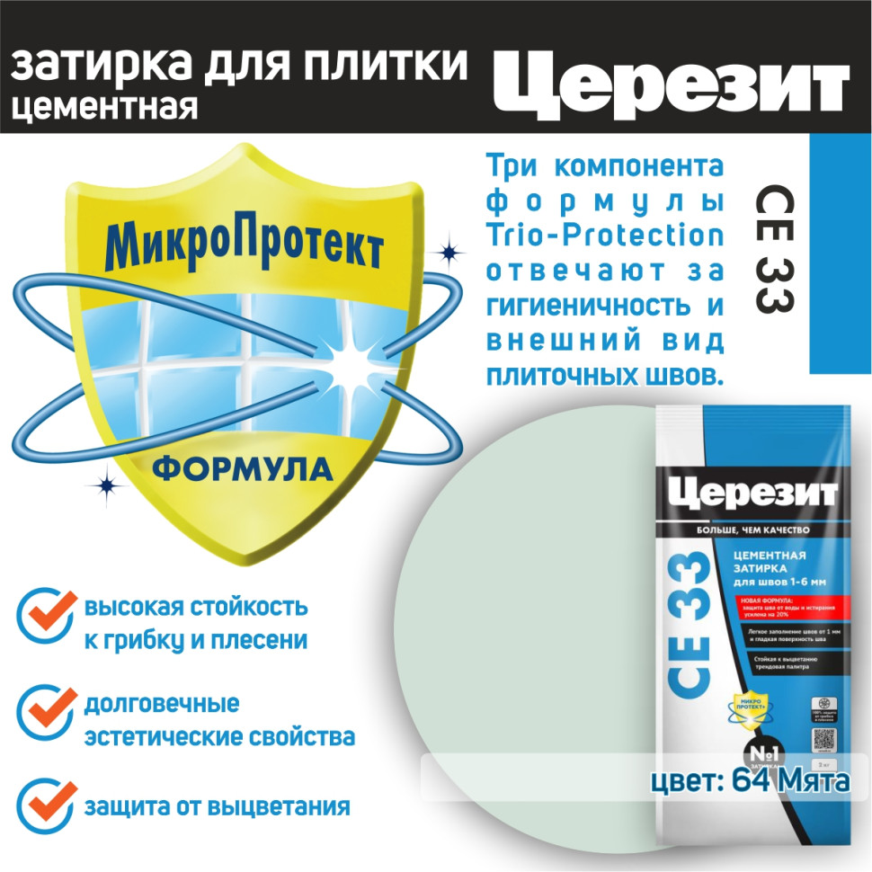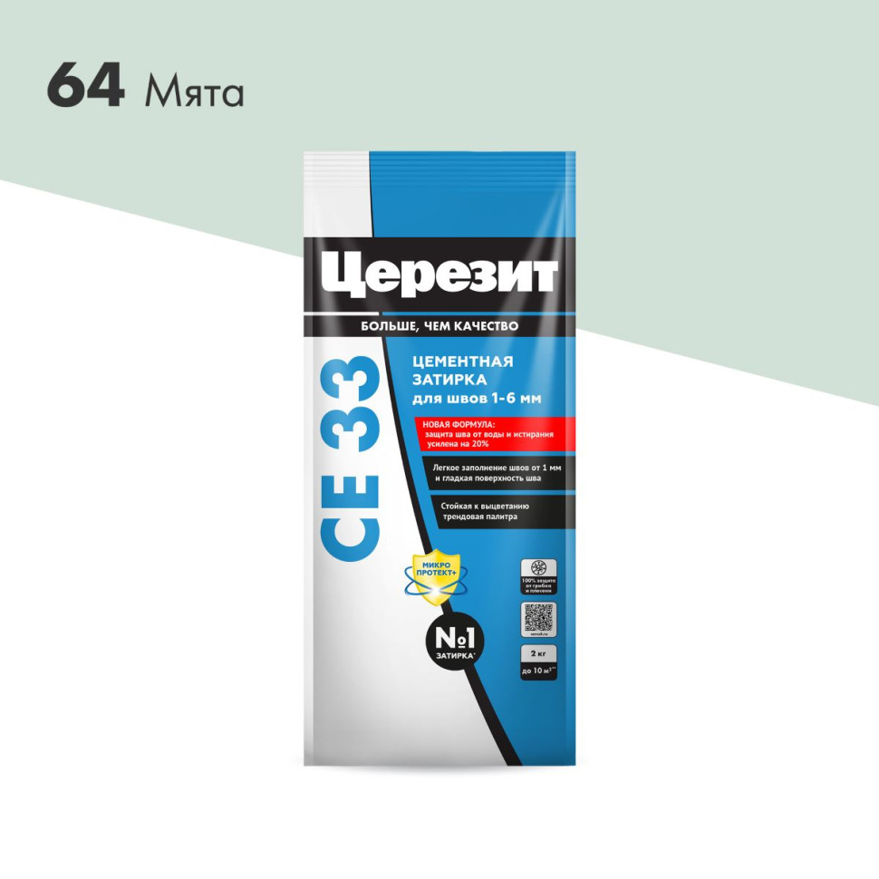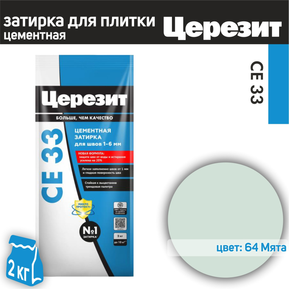 Цвет затирки Церезит СЕ33 64 - Мята - светло зеленый цвет, с холодным мятным оттенком. Фасовка 2 кг предназначена для выполнения типовых плиточных работ.